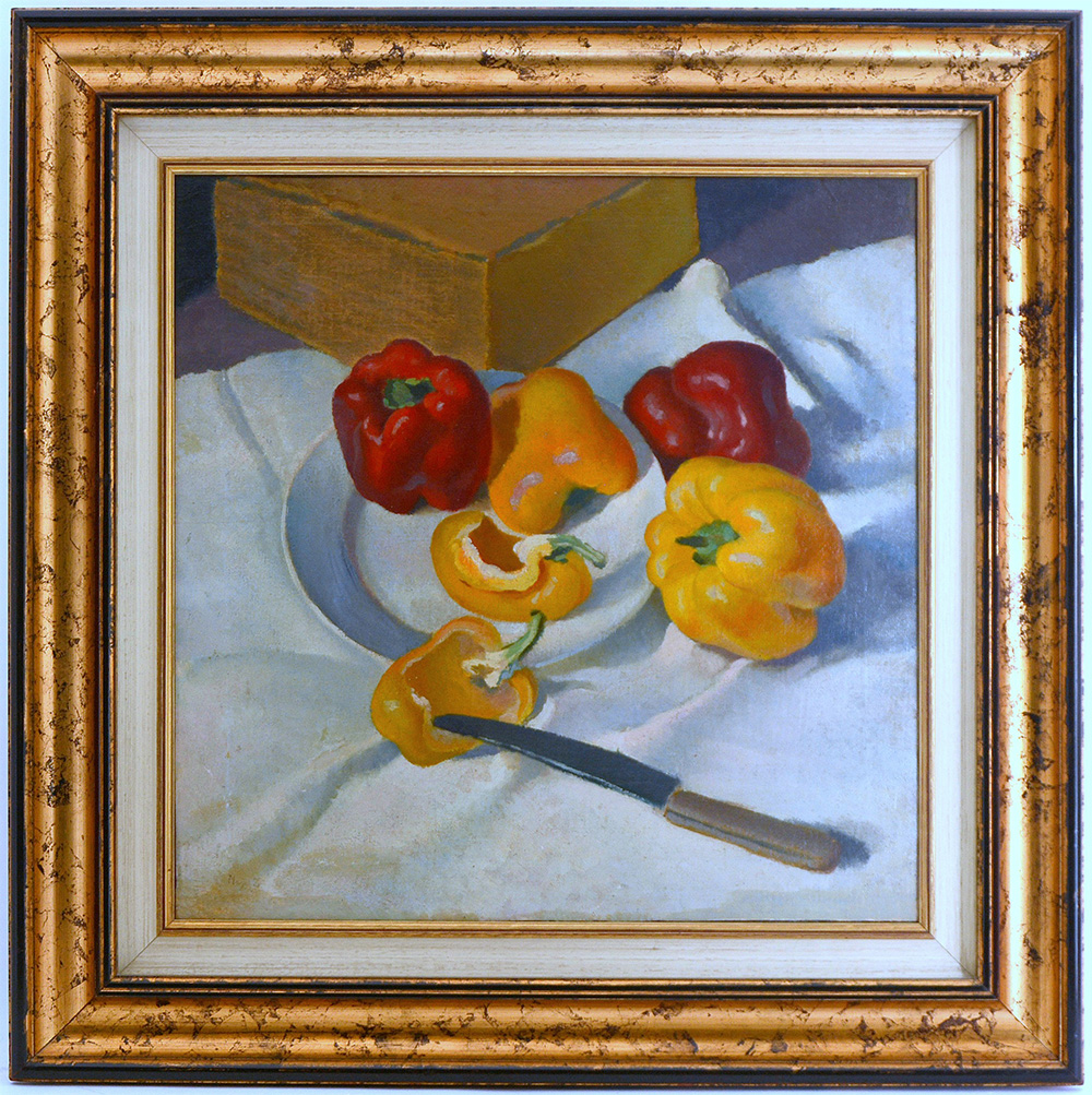 Francesco Menzio (Tempio Pausania 1899 - Torino 1979) "Natura morta con peperoni, piatto e coltello" olio su tela (cm 47x47) firmato in basso a sinistra, in cornice (difetti)