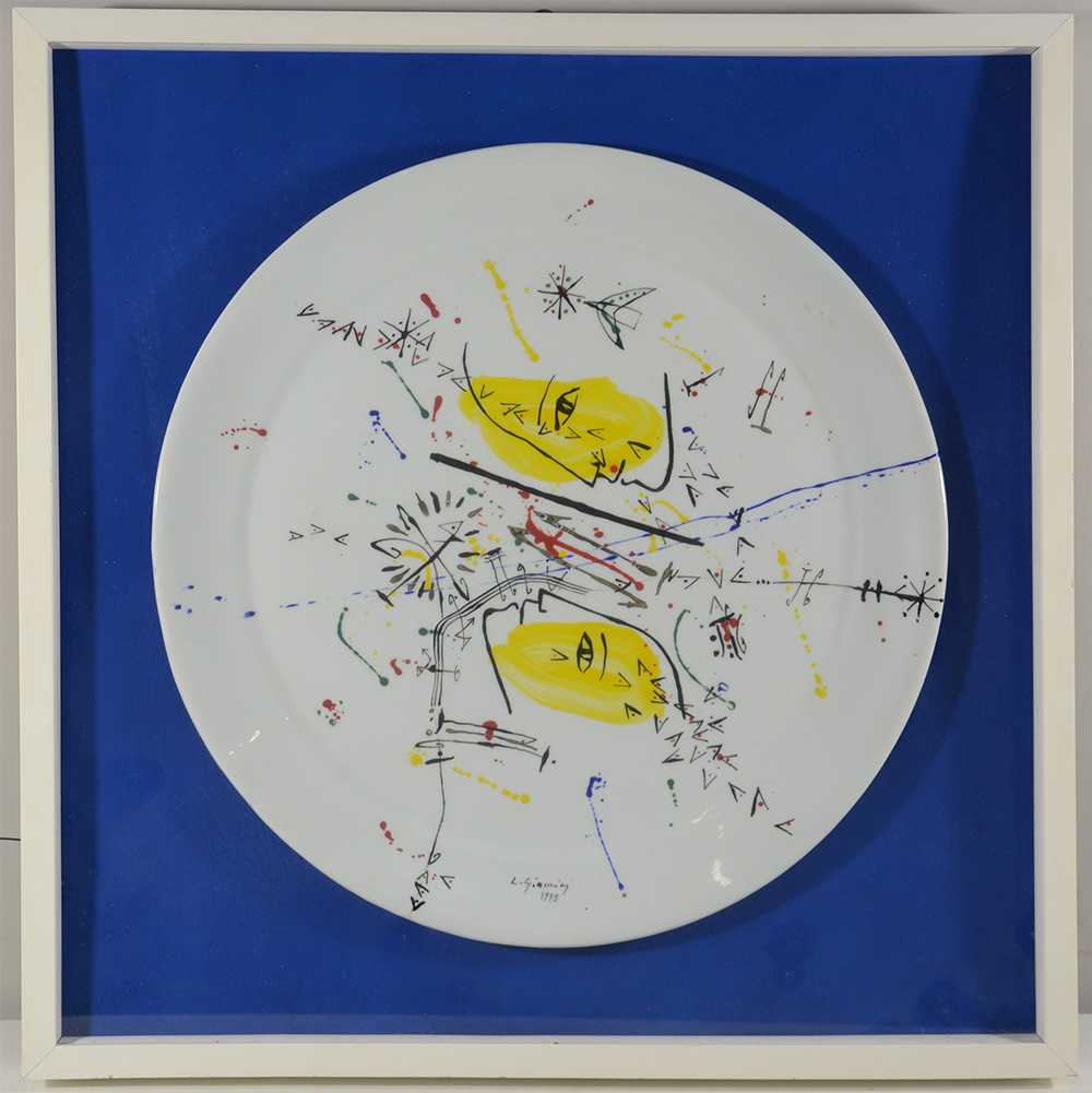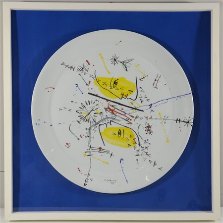 Gianni Celano Giannici (1941) "Senza titolo" 1993, piatto in ceramica dipinta (diam. cm 50,5) firmato e datato in basso al centro. In cornice (difetti)