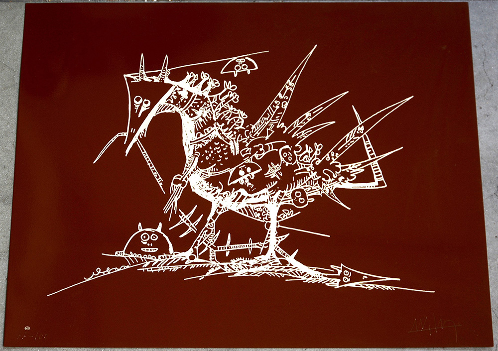 Wifredo Lam (Sagua La Grande 1902 - Parigi 1982) "Senza titolo" multiplo su lastra d'argento (cm 35x45) numerato 77/100 e firmato in basso in lastra. Opera accompagnata da autentica su fotografia firmata dall'artista.