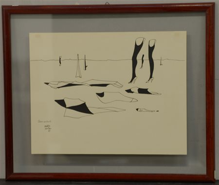 Maurice Henry (Cambrai 1907 - Milano 1984) "Chiens Couchants" 1969, china su carta (cm 31,5x40,5) titolato, firmato e datato in basso a sinistra. In cornice