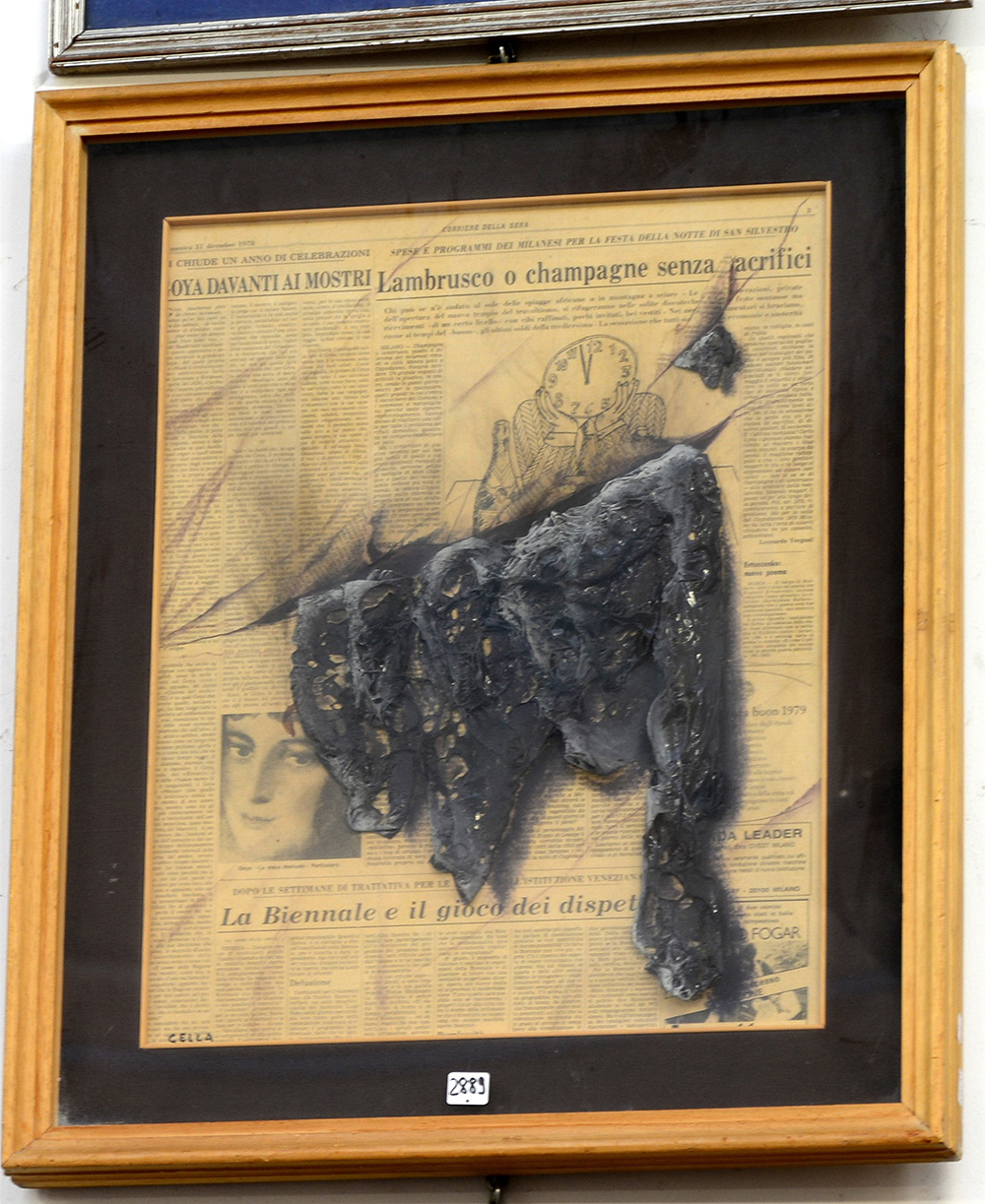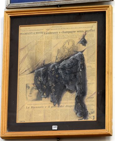 Ezio Cella (Milano 1932) “Profezie oscure” 1979, tecnica mista su carta di giornale (cm 50x40) firmato in basso a sinistra. Firmato, datato e titolato al retro. In cornice