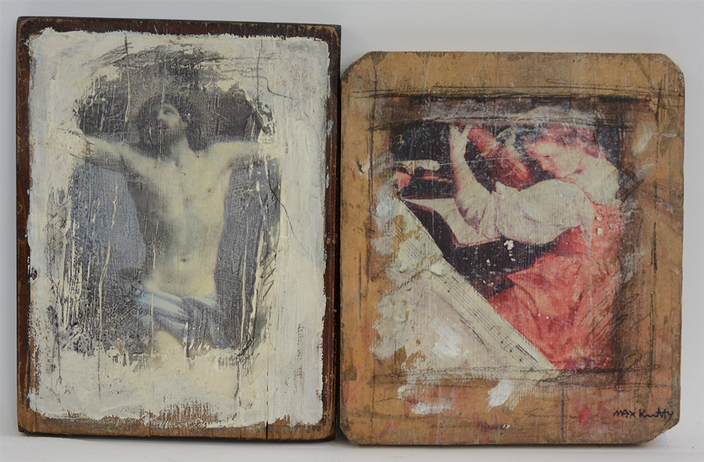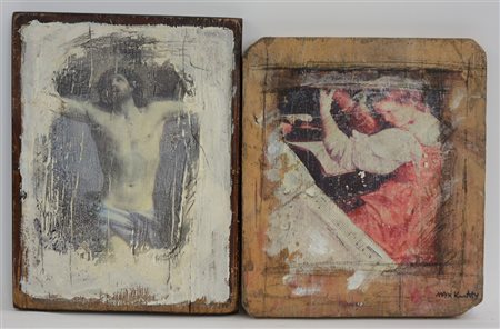 Max Kuatty (Canneto Sull'Oglio 1930 - Milano 2011) "Cristo in croce" e "Musicista" lotto di due tecniche miste su tavola, misure diverse. Una firmata in basso a destra (difetti)