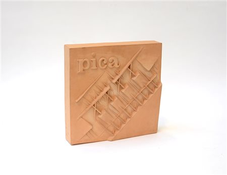 scultura-multiplo in terracotta (cm 29X29X7) firmata e numerata 34/100, eseguita per la PICA di Pesaro. Multiplo catalogato dall'Archivio Arnaldo Pomodoro con la sigla M/81 - 82/2. (Lievi difetti)