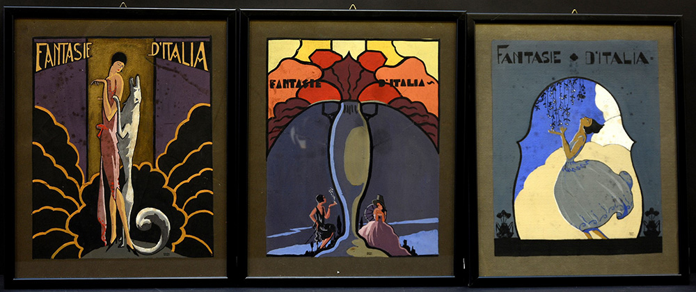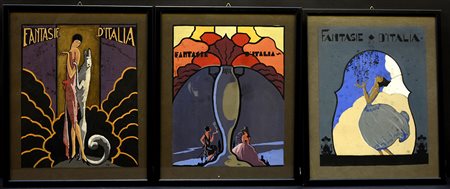 Ignoto "Fantasie d'Italia" tre tecniche miste su cartoncino (cm 38x30) firmate Serafini. In cornici (difetti)