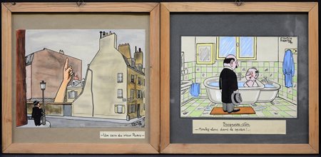 Maurice Henry (Cambrai 1907 - Milano 1984) "Un coin du vieux Paris" - "Baignoire - stop" due vignette. Tecniche miste su carta, misure diverse, firmate (lievi difetti). In cornici