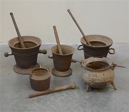 Lotto composto da due grandi mortai, tre contenitori differenti e quattro grandi pestelli (difetti)