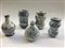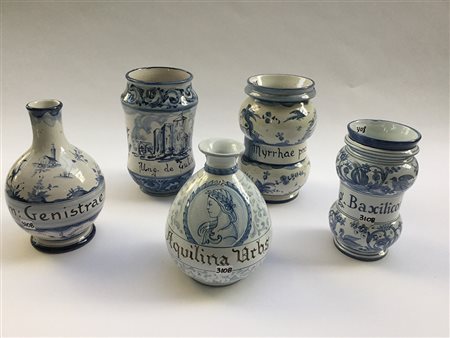 Ceramiche d’Arte Fenice, Albisola, lotto di cinque riproduzioni di vasi da farmacia in ceramica a decoro monocromo blu; produzione recente (lievi difetti)