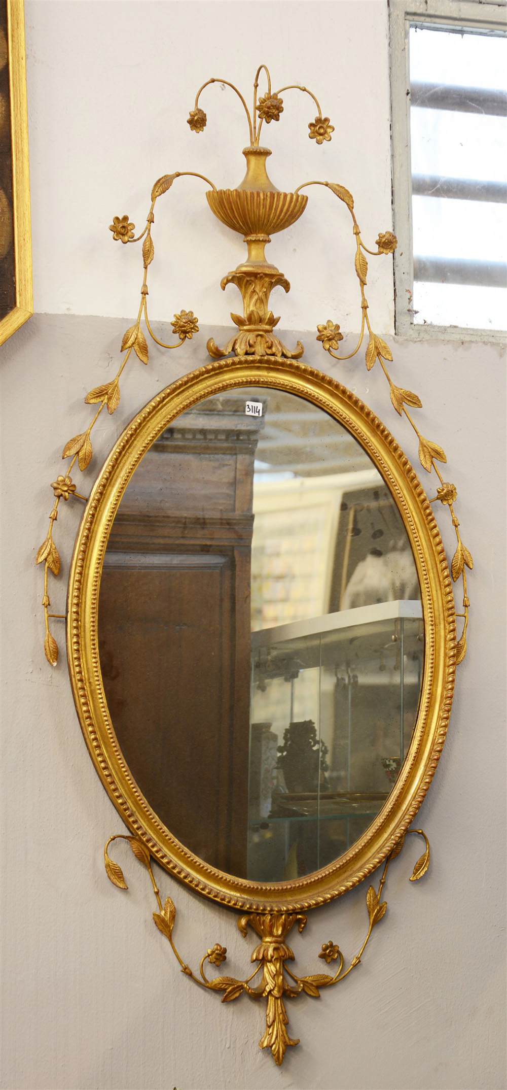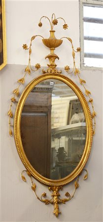 Specchiera ovale con in legno intagliato e dorato sormontata da un vaso retto da volute con cascata di foglie e fiori, sec. XX (cm 133x65)(lievi difetti)