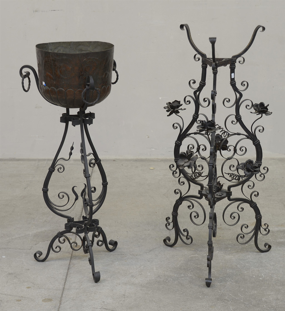 Lotto composto da due portavasi tripodi in ferro battuto, uno completo di vaso in rame sbalzato