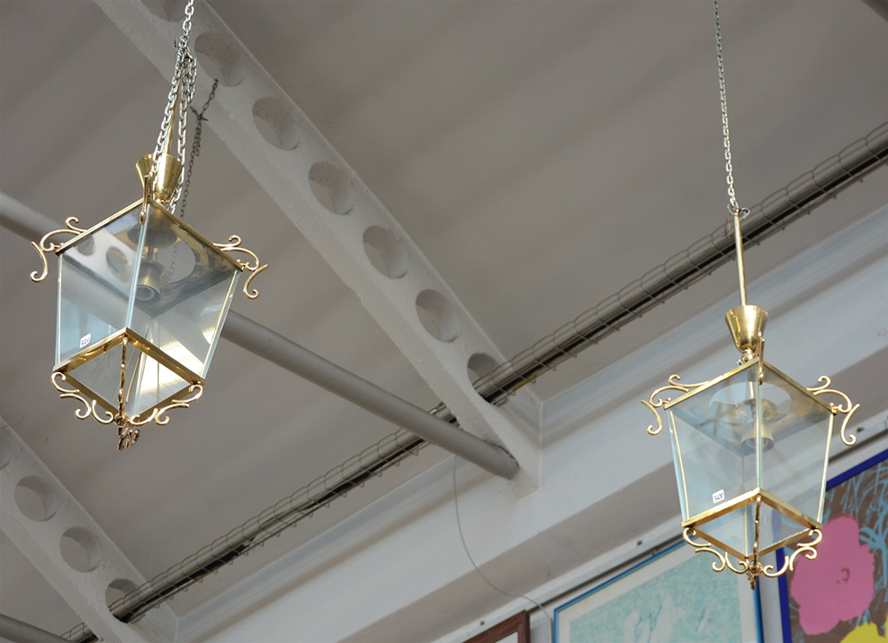 Coppia di lampadari a lanterna con struttura in ottone e lati con vetri (h cm 88)(difetti e mancanze)