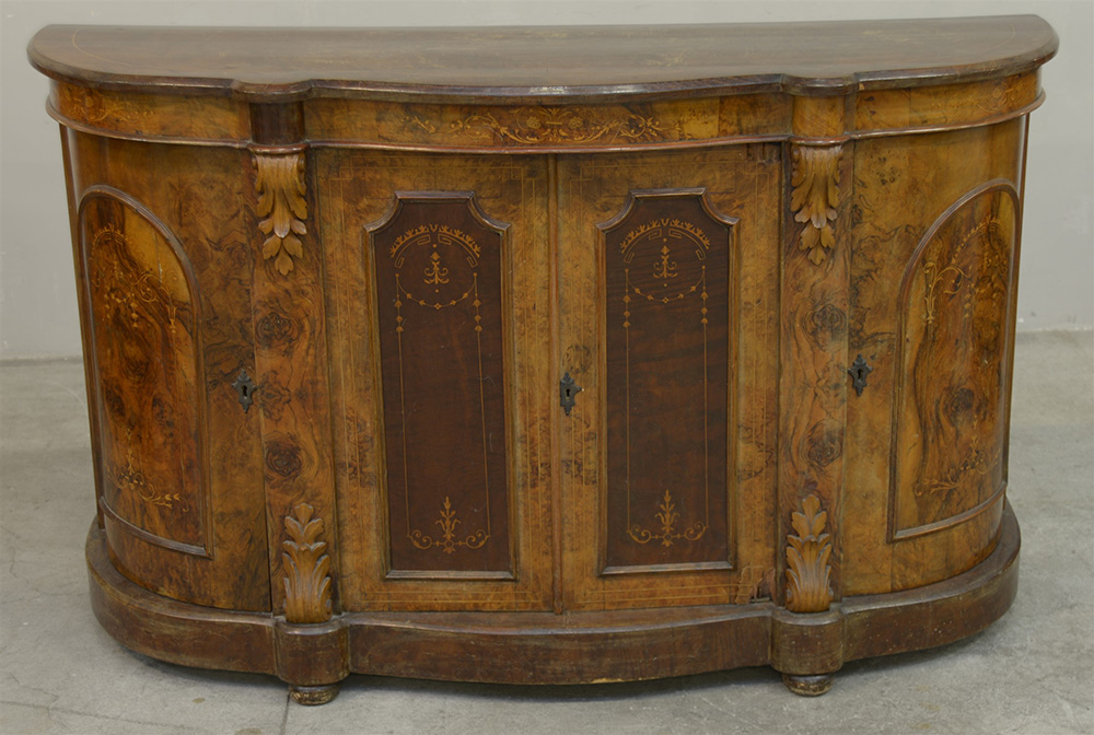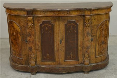 Credenza lastronata in radica di noce con elementi in legno intagliato e piccoli intarsi floreali; fronte bombato a quattro sportelli (cm 152x92x50)(difetti e mancanze)