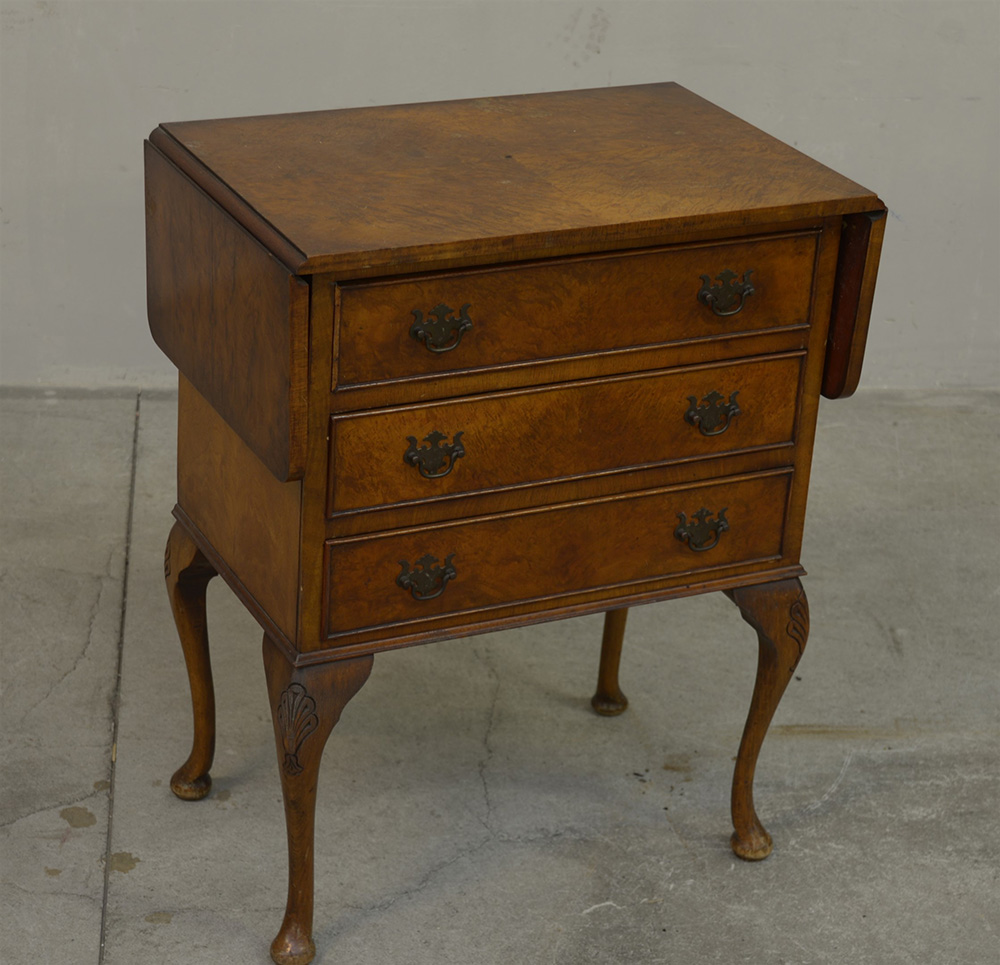 Piccolo mobile a tre cassetti con gambe mosse e piano a bandelle. Inghilterra sec XX (chiuso cm 60x73x38)(difetti)