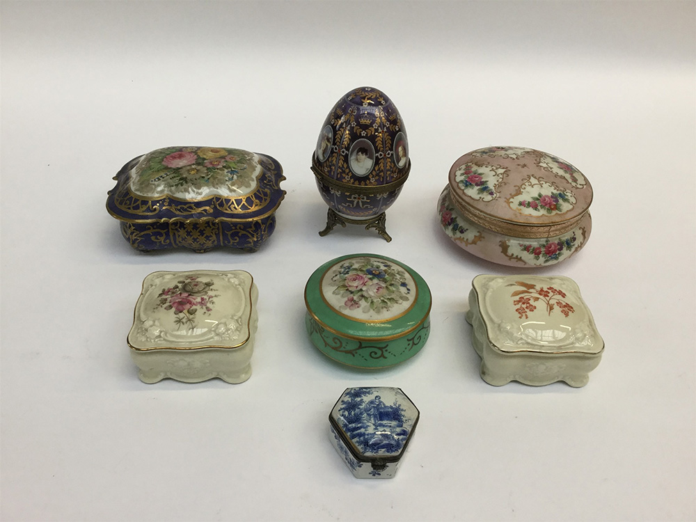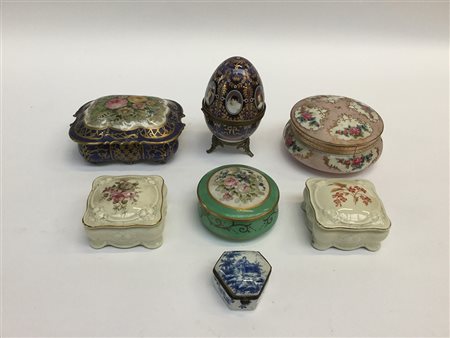 Lotto di sette scatolette in porcellana decorati in policromia di cui uno a forma di uovo, manifatture differenti (difetti)