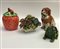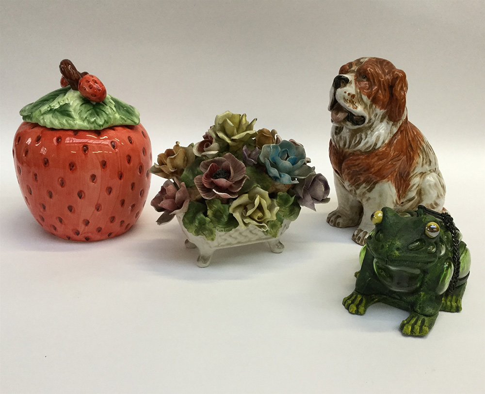 Lotto composto da un cestino con fiori in ceramica di Bassano, un cane e una biscottiera a forma di fragola in ceramica, e una lanterna in metallo e vetro a forma di rana (difetti)