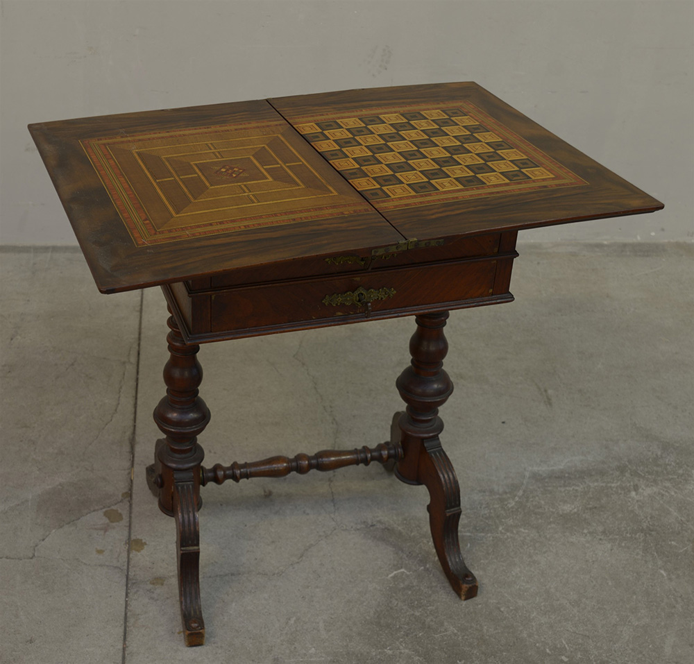 Tavolino da lavoro e da gioco con gambe a rocchetto e due cassetti nella fascia con vani portaoggetti. Piano a libro celante intarsi con caselle per i giochi della dama e della tria. Inghilterra inizio sec XX (chiuso cm 57x80x42) (difetti)