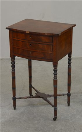 Tavolino da lavoro a due cassetti di cui uno con divisori, fronte lievemente bombato, gambe tornite con rotelle riunite da crociera (cm 48x77x37)(difetti)