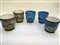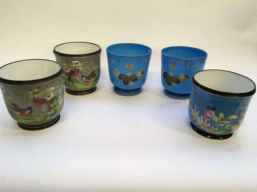 Lotto di tre cachepot in porcellana dipinta in policromia a fiori e uccelli e due cachepot in opaline (h max cm 18) (difetti)
