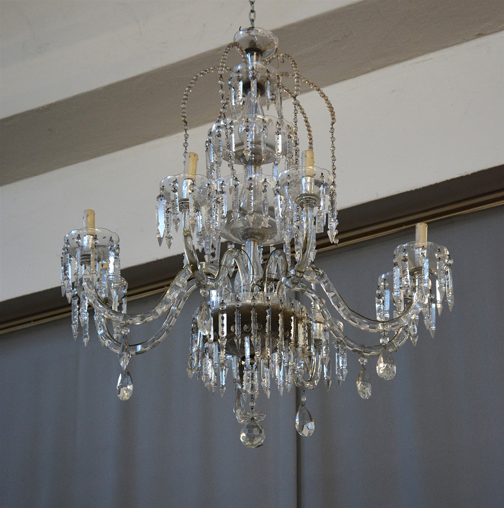 Lampadario a otto luci con struttura a fontana, braccia e pendagli in cristallo sfaccettato (h cm 100 x d cm 85)(difetti e mancanze)