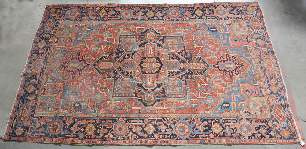 Tappeto Heritz, Persia fine sec. XIX. Disegno geometrico con medaglione policromo su fondo rosso. Angolari azzurri e rosa. Bordura Herati su fondo blu (cm 324x224)(difetti)