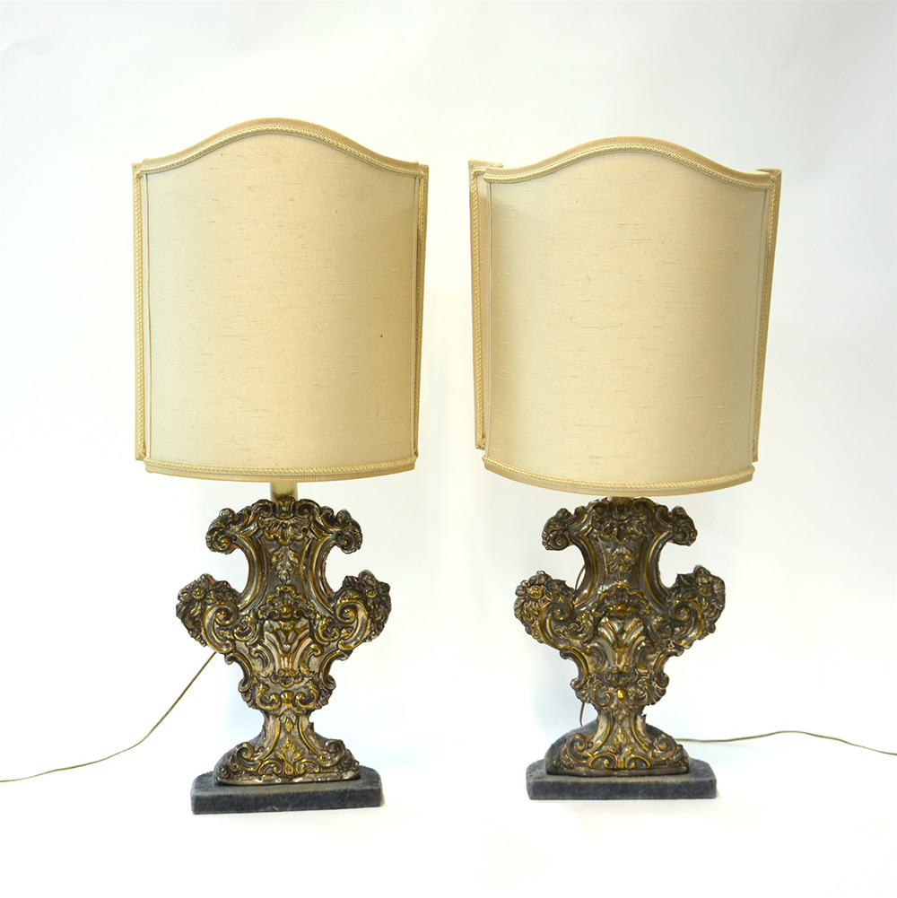 Coppia di lampade con facciata in metallo sbalzato e argentato a decoro rocaille, struttura in legno rivestita in velluto blu, complete di paralume (h cm tot 70)(difetti)