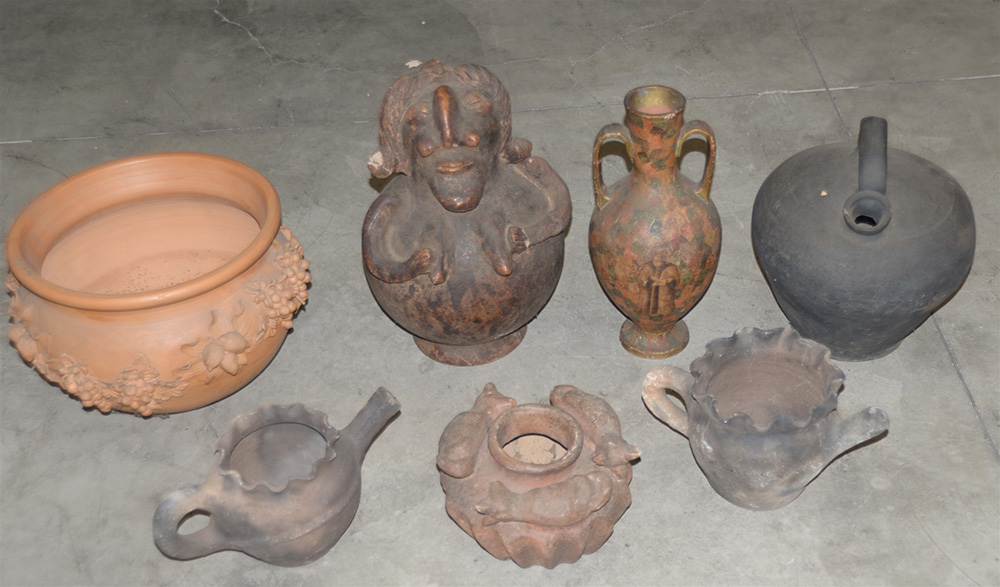 Lotto composto da un cachepot in terracotta, una scultura, un’anfora, un contenitore, un vaso decorato con gatti e due versatoi, fatture differenti (difetti)