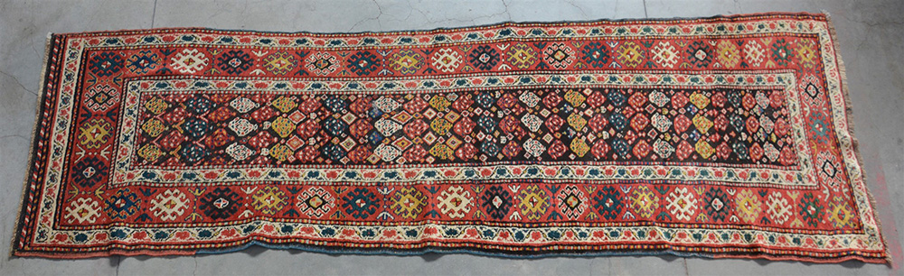 [Tappeti] Tappeto Gandjie’, Caucaso, inizio secolo XX. Disegno a file di Boteh policromi su fondo marrone scuro. Bordura a granchi su fondo rosso (cm 304x109) (difetti)