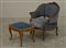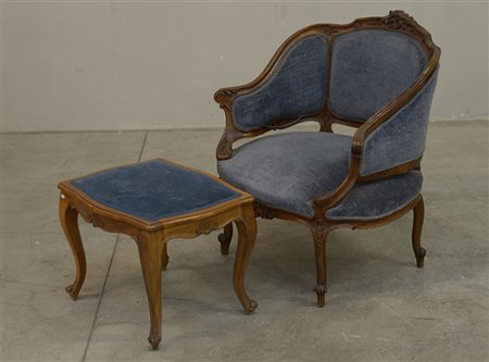 Lotto composto da una poltrona da camera a pozzetto con struttura in legno intagliato e rivestimento in velluto blu e uno sgabello rettangolare in legno intagliato con cuscino blu (difetti)