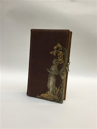 Raccoglitore per fotografie di epoca liberty con copertina in pelle impressa decorato sul fronte con bassorilievo in rame argentato e dorato raffigurante una giovinetta che regge l’album dei ricordi (cm 21x34x6,5) (difetti)