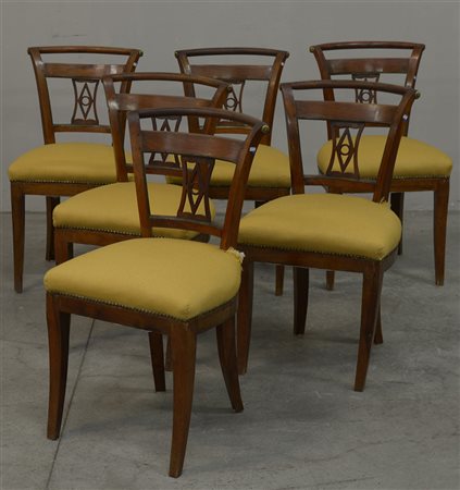 Gruppo di sei sedie in noce con gambe a sciabola, schienale a giorno con filettatura in ottone e piccoli umboni laterali, seduta imbottita in tessuto giallo (difetti)