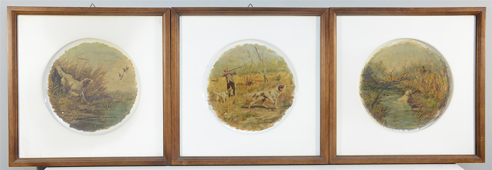 Adolfo Polaroli (1862 - 1952) Lotto di tre dipinti ad olio su piatti in ceramica raffiguranti cani nell'attività venatoria (d cm 34); piatti della manifattura Società Ceramiche Richard (S. Cristoforo) (difetti e restauri)