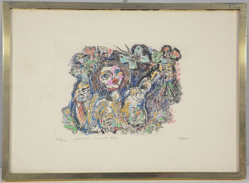 Piero Gauli (Milano 1916 - 2012) "Figura femminile con fiori" 1977, acquaforte retouche (foglio cm 35x49, battuta cm 19,5x30) firmato a lapis in basso a destra, esemplare n. 25/40; in cornice
