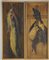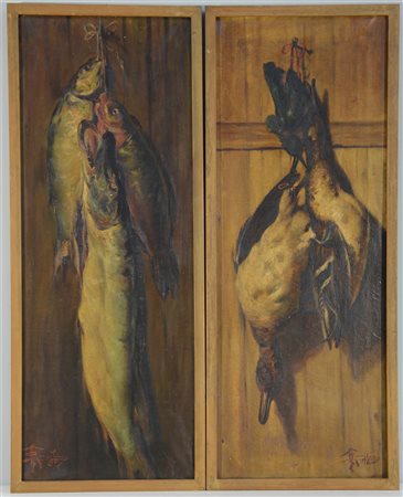 Ruggero Meneghini (1866 - 1938) “La pesca” e “La cacciagione”, coppia di olii su tela (cm 84x32) firmati in basso, in cornici (difetti)