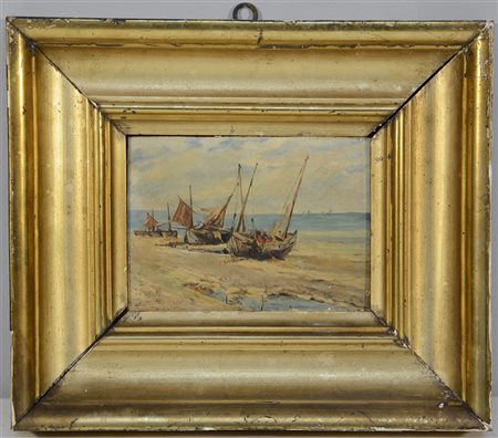 Ignoto "Pescherecci sulla battigia" olio su tavoletta (cm 13,5x18,5), in...