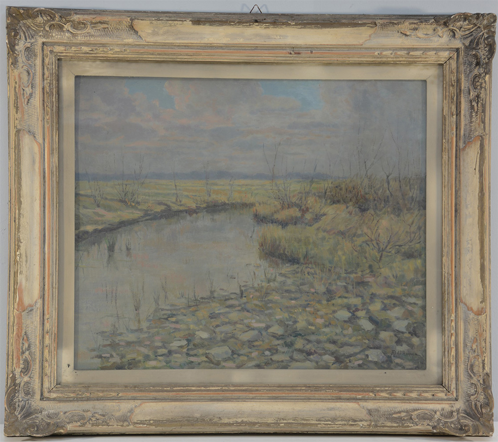 Aldo Dell'Acqua “Paesaggio fluviale”, olio su compensato (cm 49x60) firmato in basso a destra, in cornice (difetti)
