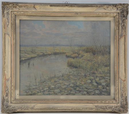 Aldo Dell'Acqua “Paesaggio fluviale”, olio su compensato (cm 49x60) firmato...