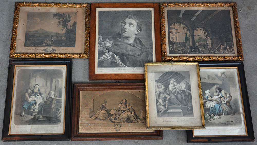 Cartone contenente sette antiche incisioni di soggetto, autori e misure differenti, in cornici (difetti)