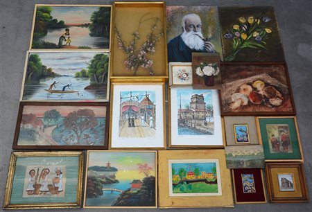 Lotto di due cartoni contenenti numerosi quadri di soggetto, tecniche e...