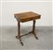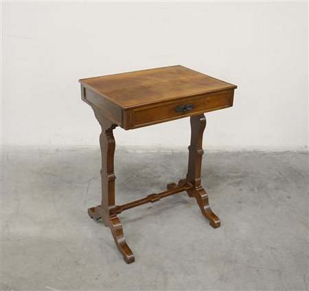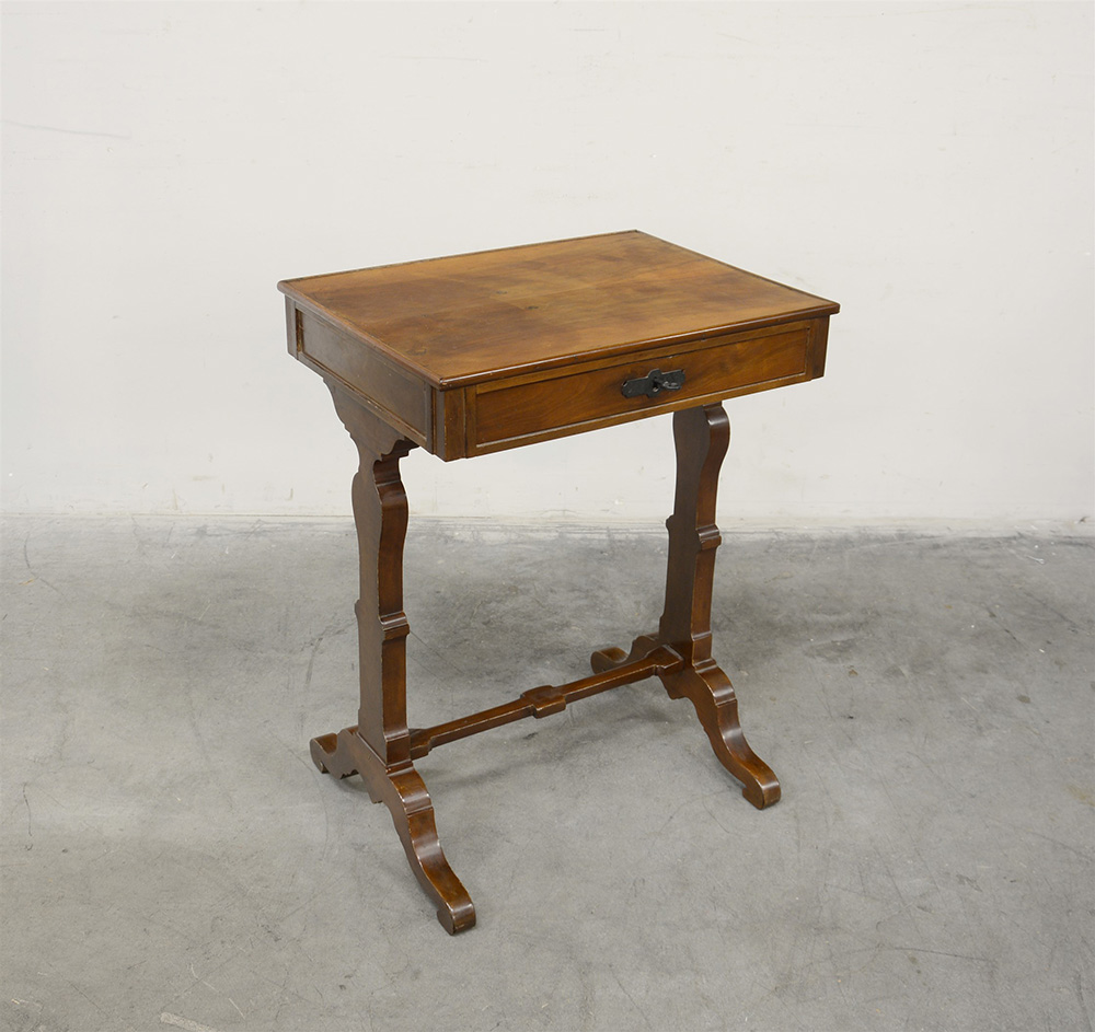 Tavolino da lavoro con un cassetto nella fascia, montanti a gambe mosse riunite da traversa; secolo XX (cm 56x73x42) (difetti)