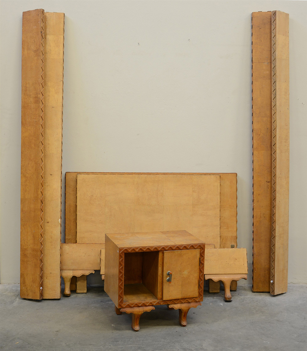 Lotto composto da due letti lastronati in radica chiara, a una piazza e una piazza e mezza, con gambe mosse. Completo di sponde, a cui si unisce un comodino anni '30/'40 del secolo XX (difetti e mancanze)
