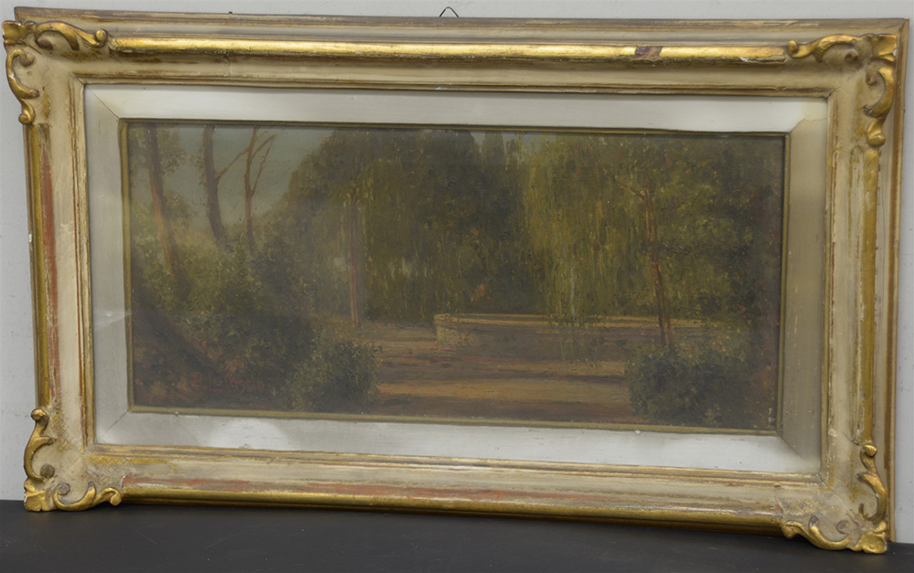 Locascio A. "Fontana con parco" olio su tela (cm 25x56) firmato in basso a sinistra, in cornice