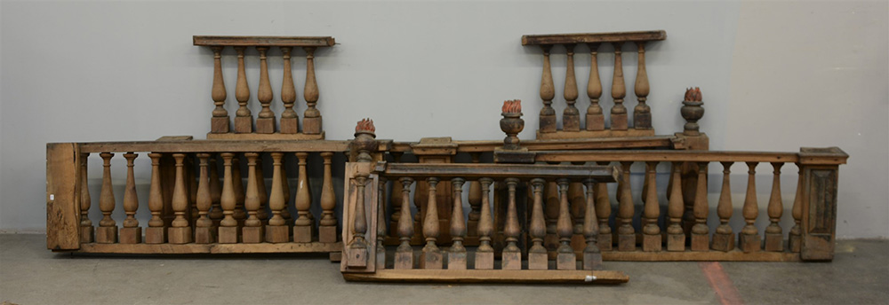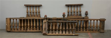 Elemento decorativo a balaustra in legno tornito con pinnacoli scolpiti a vasi con fiamma (lungh. cm 565) (difetti e mancanze) (6 pezzi)
