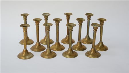 Gruppo di dodici piccoli candelieri ad una fiamma in metallo dorato (h cm 15)...