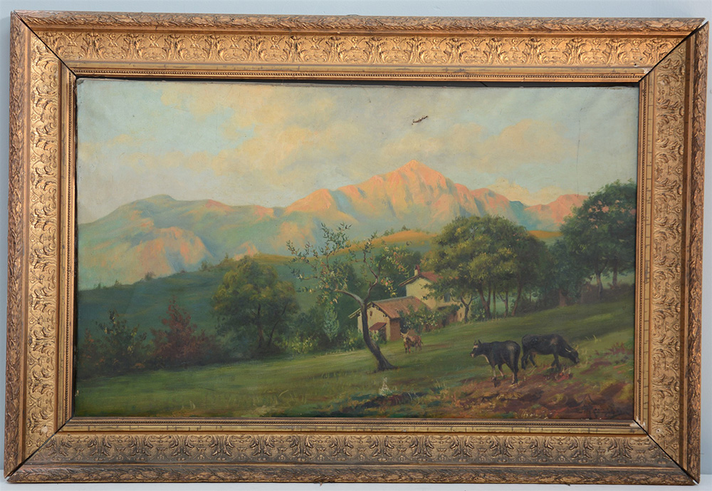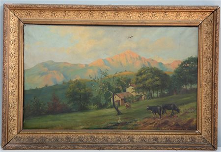 Firma indecifrata, “Paesaggio montano”, olio su tela (cm 55x90) firmato in basso a destra, in cornice (difetti)
