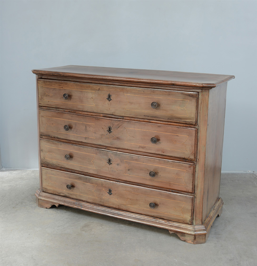Antico cassettone in noce con quattro cassetti sul fronte filettati e...
