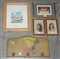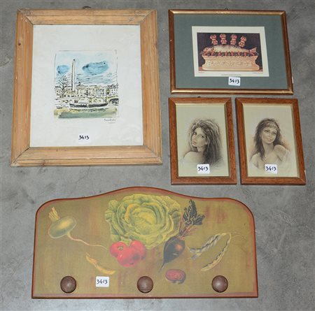 Lotto composto da un piccolo attaccapanni in legno e quattro riproduzioni diverse in cornici (difetti)