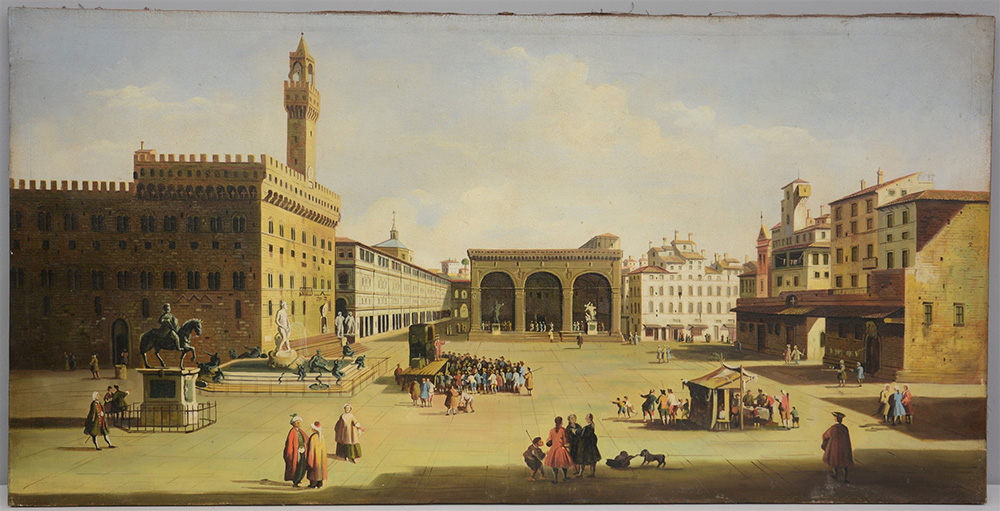 Ignoto "Scorcio di Piazza della Signoria" olio su tela (cm 60x120)(difetti)