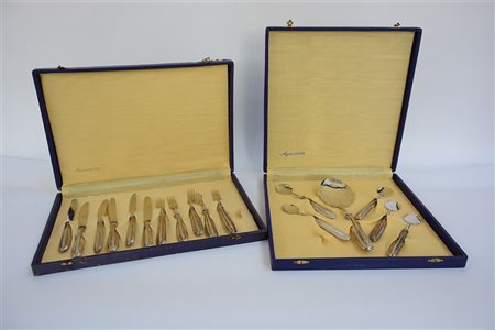 Lotto composto da un servizio da dolce composto da cinque forchette e sei coltelli e un servizio da gelato composto da una paletta e cinque cucchiaini con manici in lamina d'argento, contenuti in custodie.(Difetti)