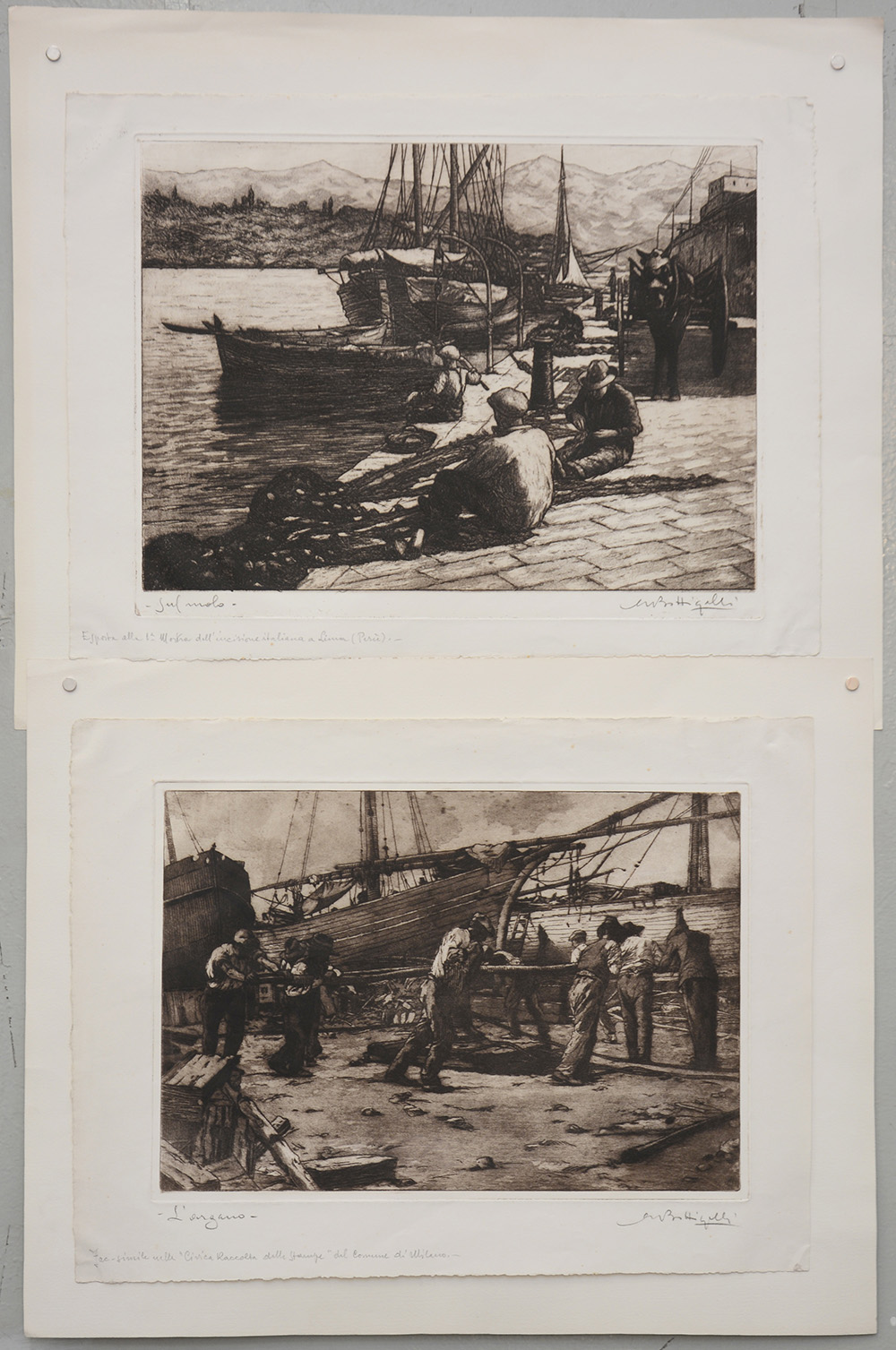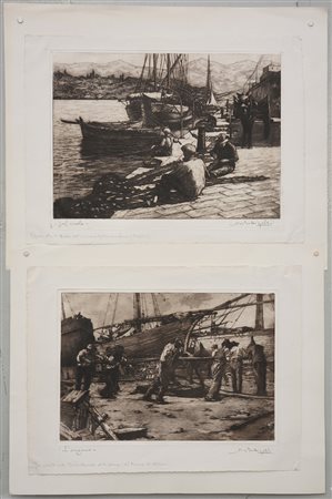 Bottigelli Angelo (Busto Arsizio 1897) "Sul molo" e "L'argano" coppia di acquaforti (foglio cm 38x51) firmate e titolate in basso a lapis (lievi difetti)