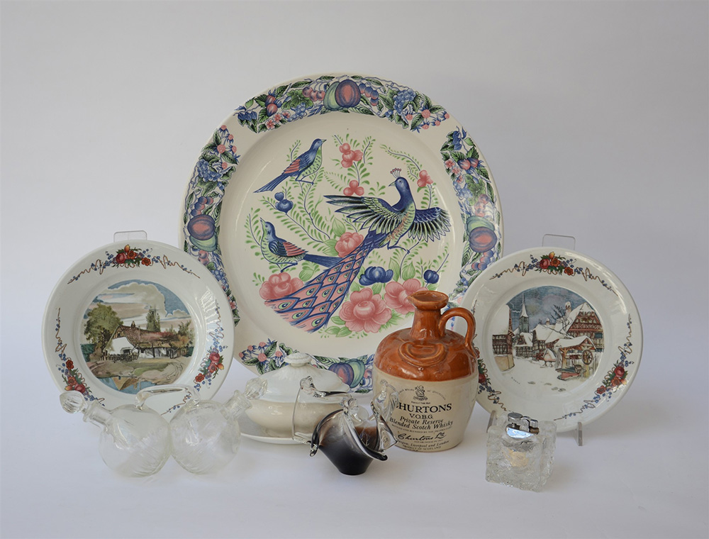 Lotto composta da tre piatti, una salsiera in ceramica, una brocchetta in terracotta e tre oggetti in vetro (difetti)