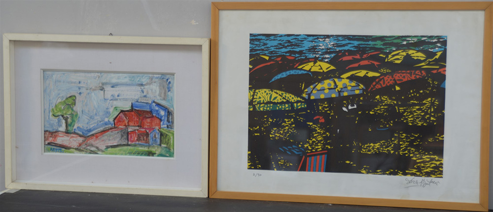 Lotto composto da un tecnica mista su cartone raffigurante case ed una litografia moderna raffigurante ombrelloni. Autori e misure diverse, in cornici (difetti)